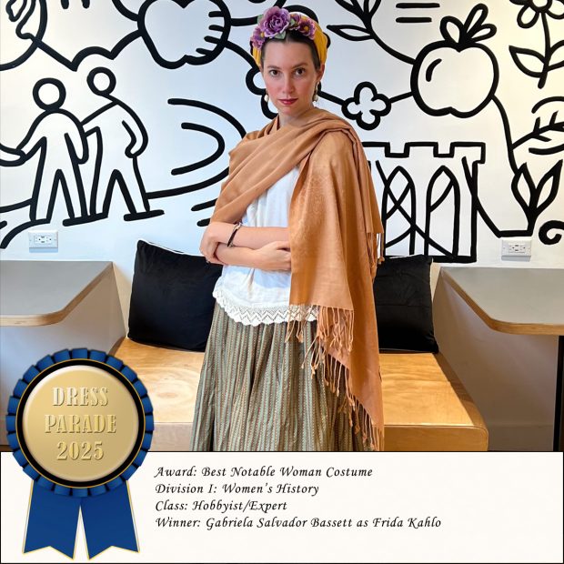 I don’t know where Gabriela had this picture taken—it looks like it could be a museum cafe—but the backdrop is perfect for Frida Kahlo. Gabriela is of course an expert costumer, but she felt this was more of a hobbyist level entry; hence the blended class. Regardless, it’s a wonderful outfit pulled off with Gabriela’s typical elegance.