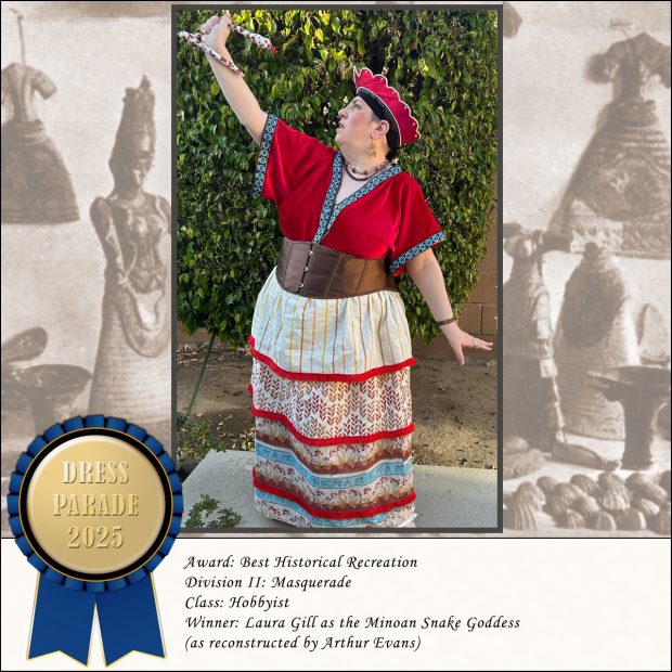 This is a reconstruction of a reconstruction, since Arthur Evans kind of dreamed up the Snake Goddess from fragments of figurines he unearthed. Maybe she was a goddess, maybe she was a priestess, maybe…who knows? Anyway, Laura’s interpretation is very sensible, I think, and captures the look without the awkward, um, bosom exposure. I think the bodice is wonderful and the flounced skirt is perfect. Great job, Laura!