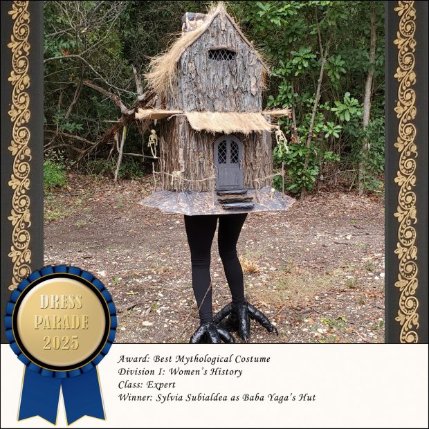 It’s canon here at Dress Parade that Baba Yaga is her hut; as Marija Gimbutas wrote in The Language of the Goddess, “The hut can turn around on its axis like a spindle and is, in fact, Baba Yaga herself.” So it’s very fitting that Sylvia here is taking what we used to call the Best Goddess prize for this astoundingly cool hut. Everything about this is on point, including the fact that the hut is backwards (or rather, Sylvia is backwards) so that Sylvia’s legs are bent in the correct bird-leg way. Amazing.