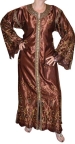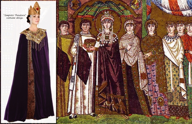 4. Moroccan caftan with embroidery. A fancy Moroccan caftan is probably the closest thing in existence to an imperial Byzantine dalmatica. Theodora would have worn a white silk dalmatica for special occasions—in the Ravenna mosaic her gown is white with an enormous border of gold embroidery at the bottom—but we thought this rich bronze caftan looked better with the outfit.