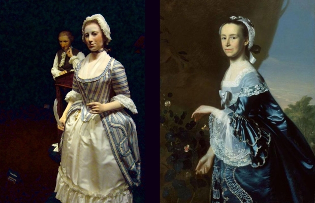 The portrait above right is by John Singleton Copley and was done when Mercy was about 35 years old. The sculpture on the left is by George Stuart. For the costume, you just need a colonial lady outfit—a rather nice-looking one, since Mercy was upper-class. The pieces we suggest, from left to right: