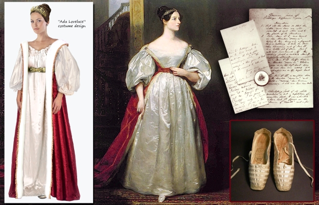 In addition to being a mathematical genius and scientific visionary, Ada was also an aristocrat. Her father was the mad, bad Lord Byron, and her husband was the Earl of Lovelace. The famous portrait of her above shows her decked out in court dress, 1836 style: white satin gown, red velvet robe, tiara. You can put together a reasonable facsimile with a long chemise and a costume king robe. The pieces we suggest, from left to right:
