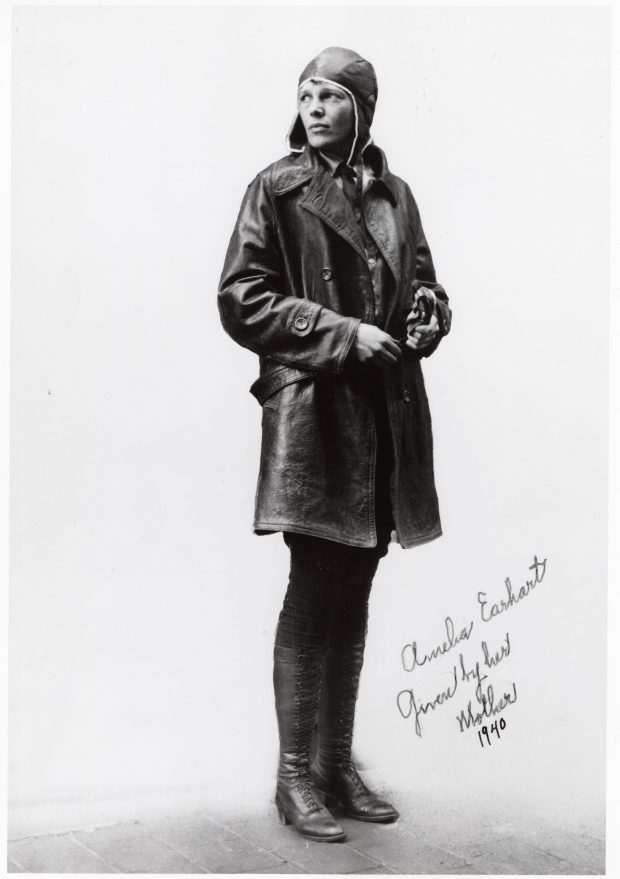 Put all that together, and you’ll be the spitting image of Amelia as she appeared in the star-making photo that ran in the New York Times on June 10, 1928 (above and in our main illustration). If you want to carry the effect even further, wear a button-down shirt with a man’s tie. That seems to be what Amelia’s got going on in the picture. She also has on either a vest or a sweater, or maybe even a jacket underneath her coat. It was cold up in those little planes!