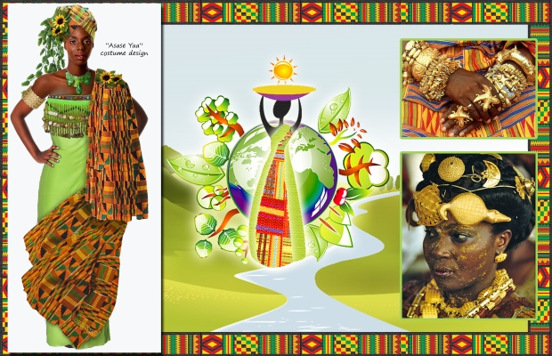 Asase Yaa is the earth goddess of the Asante people in Ghana. She created human beings and receives them back into her body when they die; she is also the mother of the gods. There are no temples to her, for the earth itself is both her body and her temple. There are also no standard anthropomorphic depictions of her, which means we’re free to come up with our own costume. Our design is a blend of inspirations: the kente cloth and fabulous gold jewelry of Ghanaian royalty (inset photos in our main illustration); the green plants and sparkling gems that are the gifts of the earth; and the libations that farmers pour out to Asase Yaa in their fields.