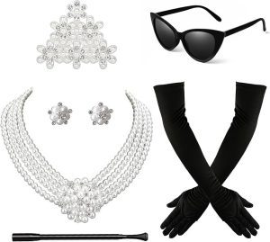 2. Accessory set. This set includes a costume necklace, modeled after the fabulous one Audrey wore in the move, along with earrings, a little tiara, a cigarette holder, and (again) sunglasses and gloves. These gloves are probably better than the ones that come with the dress (#1).