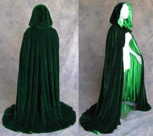 1. Green velvet cloak. This gorgeous cloak from Artemisia Designs is made of rich green velvet and lined with green satin. Very goddessy.