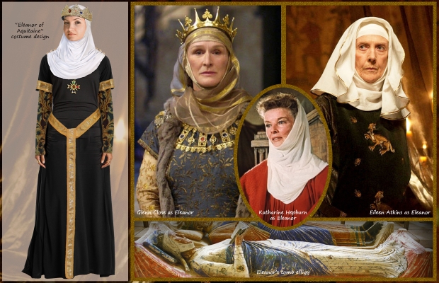 Eleanor was renowned in her day as a beauty and a fashion plate, but the only real likeness we have of her is the tomb effigy at Fontevrault (see our main illustration above). It was the Middle Ages, after all; even kings and queens weren’t in the habit of having their portraits painted. In fact, nobody even recorded what color Eleanor’s eyes and hair were. So when most of us picture Eleanor of Aquitaine, we’re really thinking of Hollywood: Kate Hepburn in The Lion in Winter, Glenn Close in the remake of the same, Eileen Atkins in Robin Hood. Our costume is a nod to those memorable movie costumes, but using super-easy modern garments. It won’t win you any authenticity awards for historical recreation, but you’ll look marvelous. The pieces we suggest, from left to right: