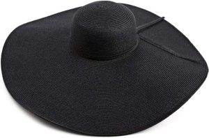 2. Wide-brim black hat. This wonderfully gigantic hat has an adjustable sizing tie to help it fit your head.