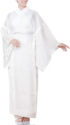 1. White cotton under-kimono. This will be thin, so you’ll need to have foundation garments, but it’s the simplest way to get the look of a plain white robe such as Himiko might have worn.