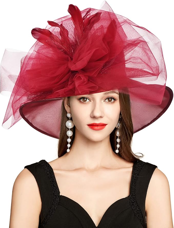 2. Burgundy organza picture hat with feathers. You’ll want to wear this cocked back on your head a bit to frame your face.