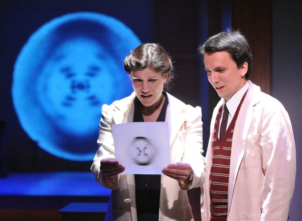 Modern theatrical productions usually portray Franklin as a stylishly dressed lady in a lab coat, which seems pretty close to the mark. For example, here’s Kristen Bush as Rosalind Franklin in the Ensemble Studio Theatre production of “Photograph 51” by Anna Ziegler, costume design by Suzanne Chesney (photo credit: Suzanne Chesney):