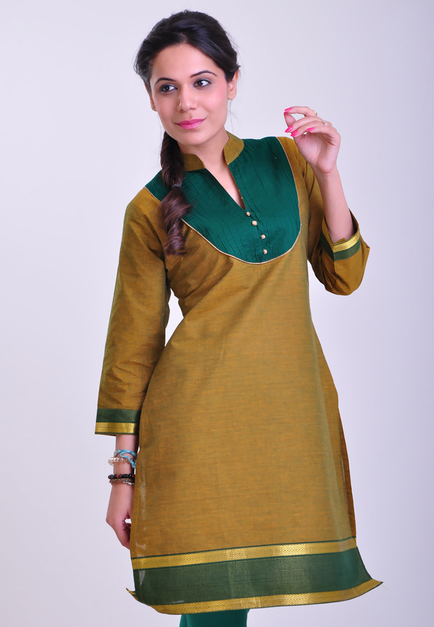 1. Cotton kurti. Look for one like this that has a simple design—no modern prints—for an archaic look. Add leggings or narrow narrow trousers that will fit into boots (next).