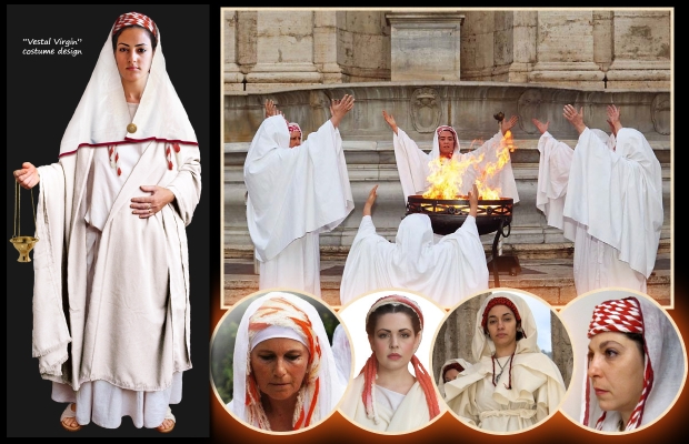 Illustration credits: Our main illustration shows various recreations of Vestal attire by modern reenactors and archaeologists. The large photo is of a ceremony performed by the Associazione Culturale Gruppo Storico Romano. The small round images at the bottom are, from left to right: a Vestal reenactment by Les Amis de Kleio en Provence; the Vestal hairstyle recreation by hairdresser-archaeologist Janet Stephens (the model is Rachael Pietra); Adriana Serpi of the Associazione Culturale S.P.Q.R. in costume as the chief Vestal; and a Vestal reenactment by A.R.S. Romana Historia.