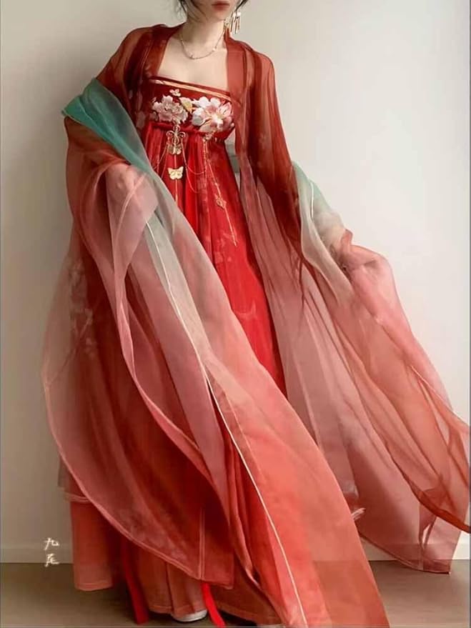A simple way to approximate that look is to pair a strapless gown with a big kimono-sleeve robe, the gauzier the better. Use solid colors or Chinese-style fabrics; avoid any modern prints. You can also try using hanfu costume pieces from the internet, as listed below.