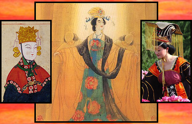 Wu Zetian (624-705) was the only woman to ever rule as Empress of China. We show three depictions of her above: on the left is an antique portrait, on the right is a photo of an actress in a historical pantomime, and the center sketch shows Wu Zetian in the typical dress of the period. That’s the effect we’re going for—Tang Dynasty style, strapless underdress, flowing transparent robe with huge sleeves.
