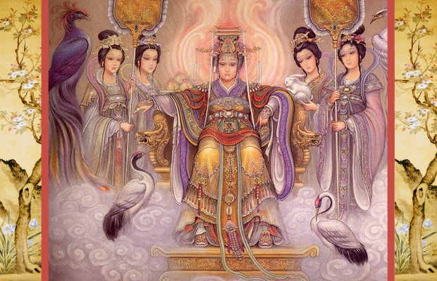 Xi Wang Mu, the “Queen Mother of the West,” is the fairy goddess of Chinese lore. She lives in a jewel-encrusted palace on a solid gold mountain far to the west, where she is attended by jade maidens. She flies on the back of a crane, keeps bluebirds as messengers, and grows the Peaches of Immortality in her garden. Though you can’t tell from the picture above, she’s believed to have long white hair, symbolic of longevity.